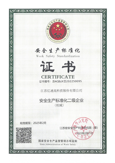 日前,億通科技通過了安全生產標準化二級企業審核,并獲得安全生產標準化證書(機械)。公司將繼續加強安全生產標準化工作,建立建全安全管理制度和操作規程,排查治理隱患和監控重大危險源,落實安全生產責任,持續提升企業安全生產規范化建設。
